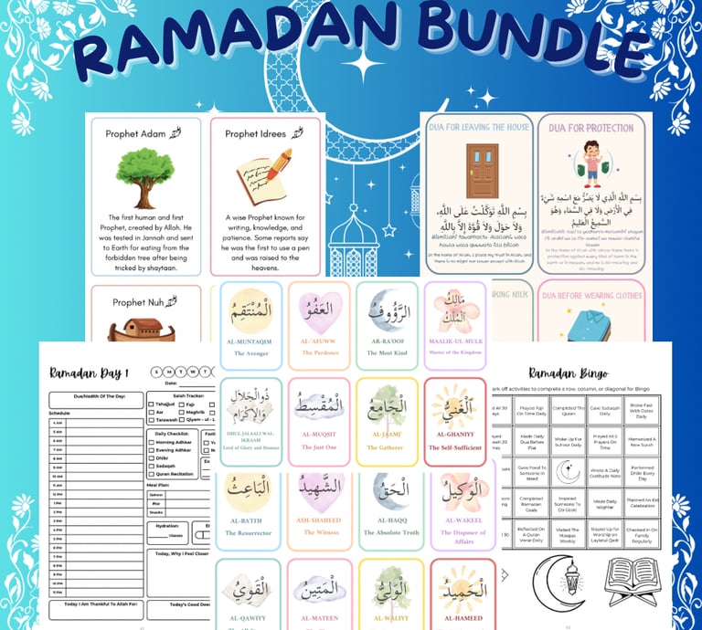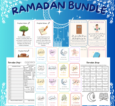 Our 90+ page Ramadan Bundle is the perfect way to engage your child this holy month! It includes activities like learning the Names of Prophets, memorizing Duaas, and reflecting with a Ramadan Journal. Instant downloadavailable to start your child’s spiritual journey today